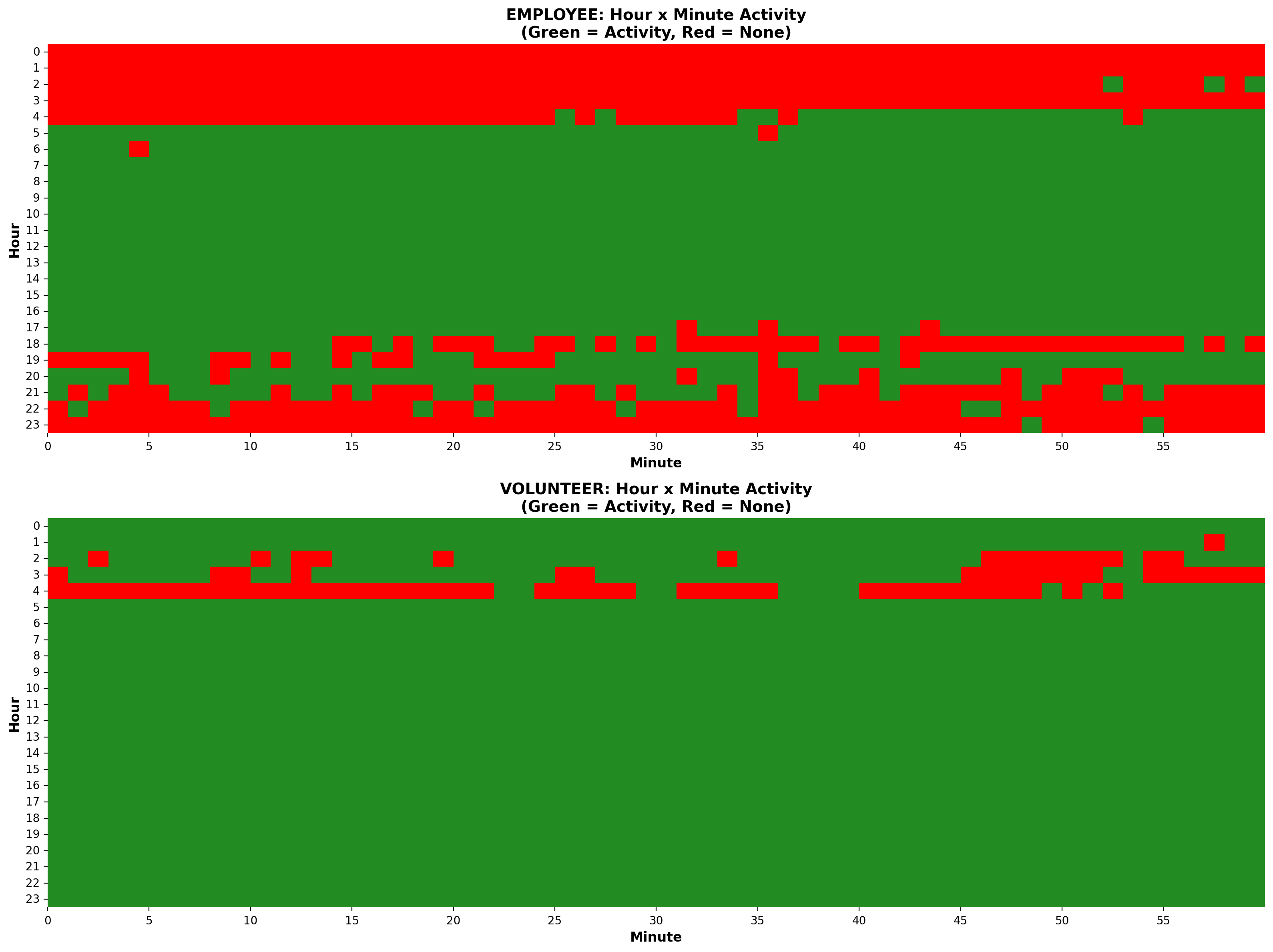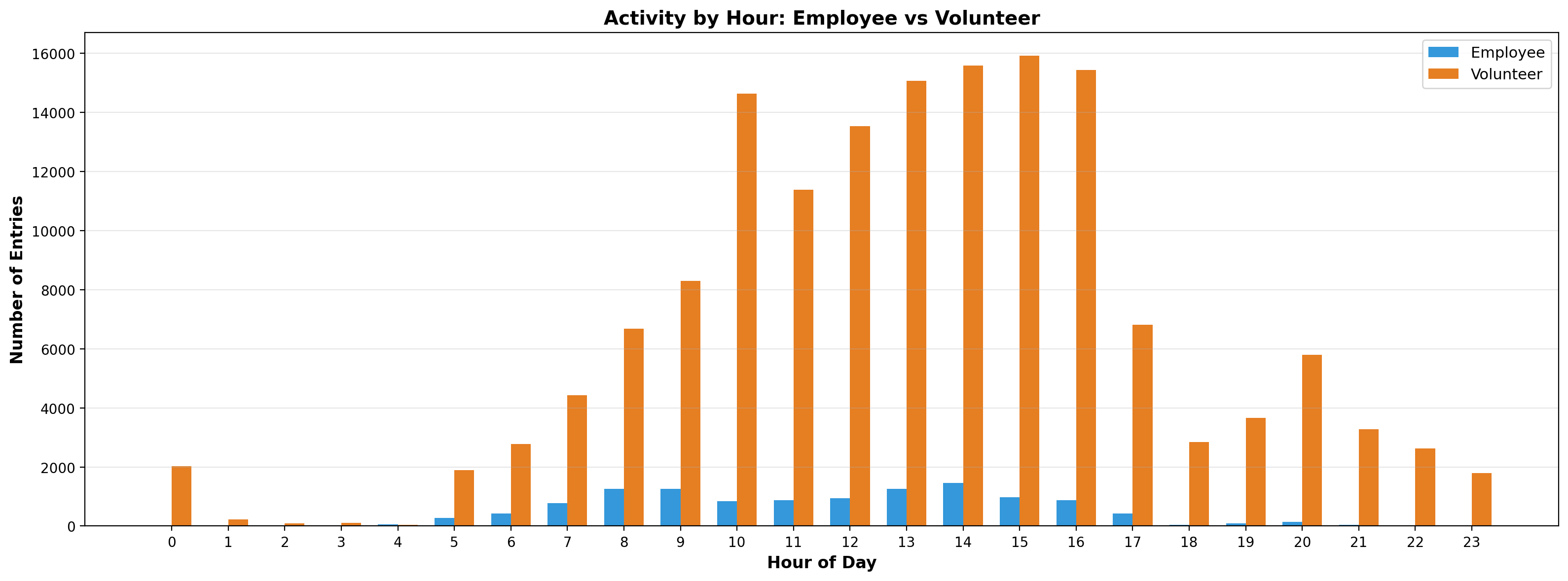When I made the switch from volunteer to employee, I struggled to cut back the time I was putting in. This was a habit I brought with me rather than something that the role necessarily demanded. The data shows that 46% of the logged non-classification timestamps fell outside of mySociety core hours, and 32% outside of my usual flexed hours. There was even work logged on 20% of all weekend days. This significantly improved when my boss started checking in about this every week, serving as a valuable counter to my habitual stubbornness. My volunteer hours were similarly varied.
